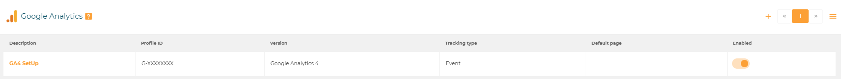 This will then show you all of your current Google Analytics set ups. You can toggle the set ups to enabled or disabled, add new setups by clicking the plus icon or amend the existing setups by clicking the description name in orange.