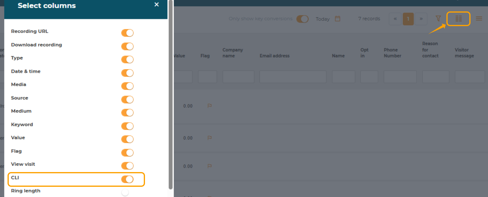 - Click on the column selector to ensure that the CLI option has been toggled on.