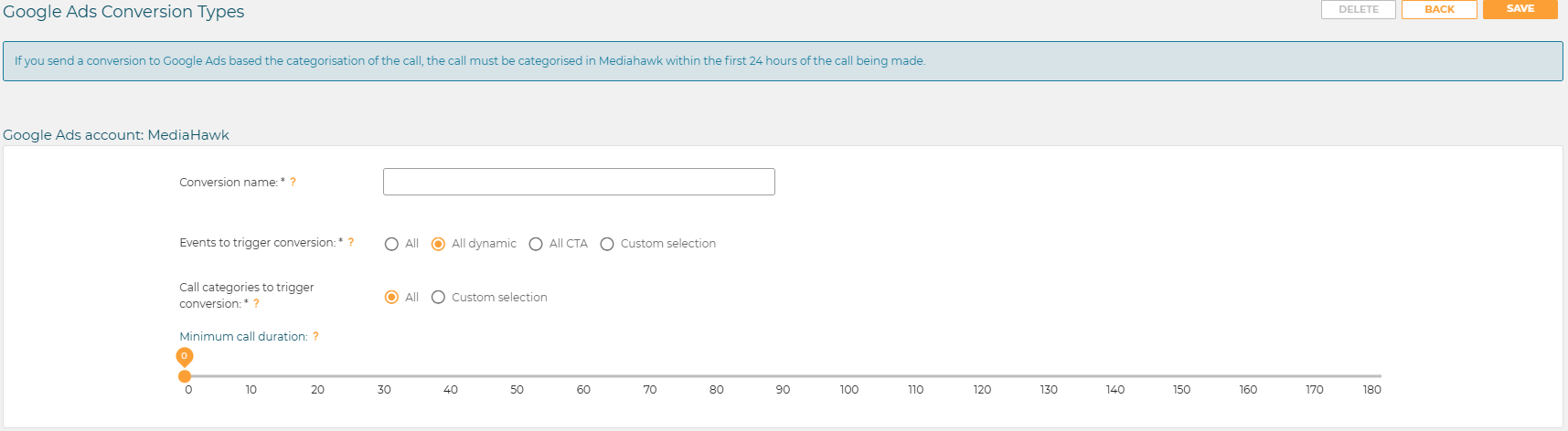 Minimum call duration: You can click and drag the minimum call length so that only calls over this timeframe (seconds) are sent as conversions into Ads