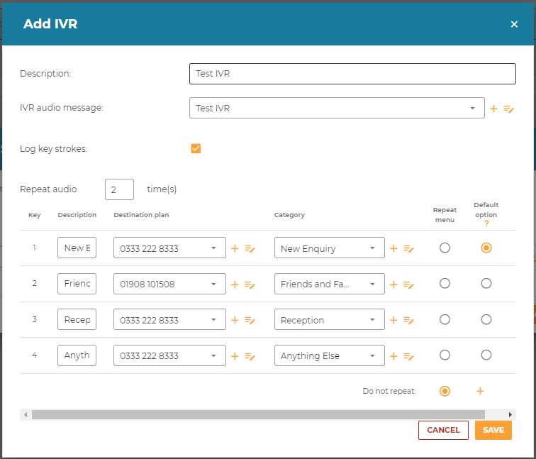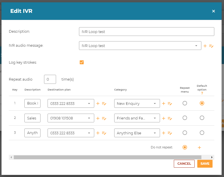 Repeat audio _ time(s) - this will allow you to repeat the IVR audio message if no selection is made. Usually we would advise to input 0-3 depending on your preference.