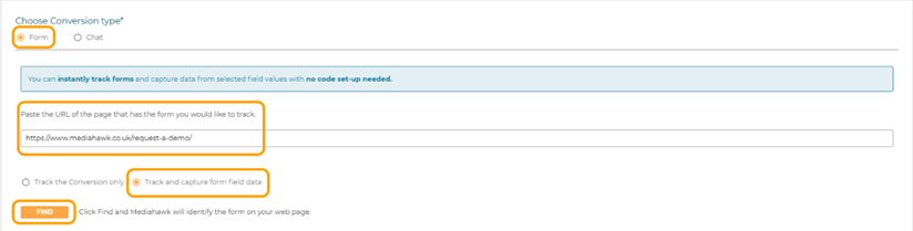 Selecting the conversion type will populate the screen with the relevant fields to set up a form or chat. When Form is selected, you are prompted to paste the URL of the page that has the form you would like to track.
