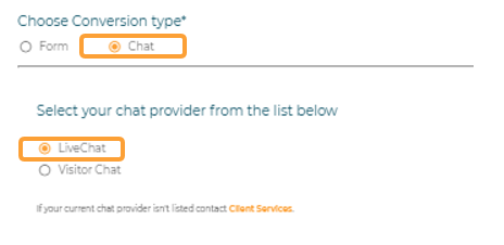 Selecting the conversion type will populate the screen with the relevant fields to set up a form or chat. When Chat is selected, you are prompted to select between LiveChat and Visitor Chat. These are currently the only choices available, however please contact clientservices@mediahawk.co.uk if you use a different provider.