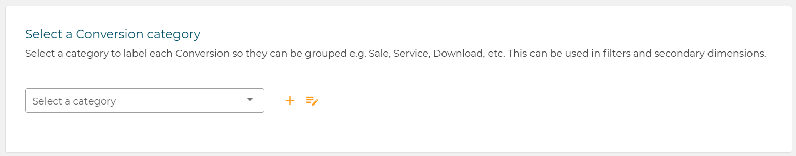 You should then create or select a conversion category. This assigns a label to each conversion so they can be grouped e.g. Sale, Service, etc. These can then be used in filters and secondary dimensions to gain more granularity in your reports.